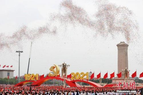 7月1日上午,慶祝中國(guó)共產(chǎn)黨成立100周年大會(huì)在北京天安門廣場(chǎng)隆重舉行。圖為慶祝大會(huì)現(xiàn)場(chǎng)放飛氣球。 中新社記者 韓海丹 攝
