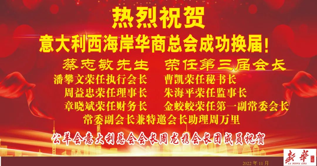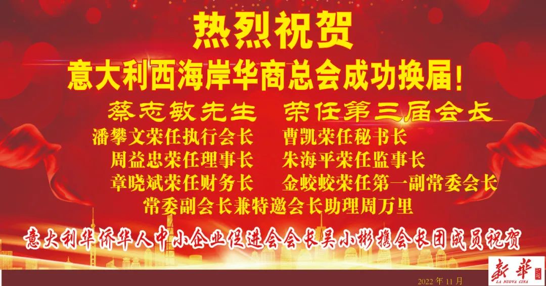 意大利西海岸華商總會(huì)換屆后,蔡志敏先生榮任第三屆會(huì)長(zhǎng),潘攀文榮任執(zhí)行會(huì)長(zhǎng),曹凱榮任秘書(shū)長(zhǎng),周益忠榮任理事長(zhǎng),朱海平榮任監(jiān)事長(zhǎng),章曉斌榮任財(cái)務(wù)長(zhǎng),金蛟蛟榮任第一常副委會(huì)長(zhǎng),周萬(wàn)里榮任常委副會(huì)長(zhǎng)兼特邀會(huì)長(zhǎng)。商會(huì)將繼續(xù)凝僑心、筑僑力、謀發(fā)展,為實(shí)現(xiàn)中華民族偉大復(fù)興的愿景做出貢獻(xiàn)。
