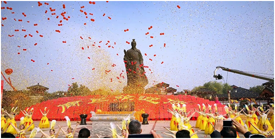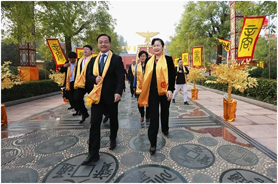 朱奕龍恭讀拜謁文;19名華商代表先后向華商始祖王亥雕像恭敬上香;9位代表來到敬香臺前,領誦《商愿辭》;20位代表到“誠信簽字版”前簽字留念,并到祈愿樹前系上象征著幸福吉祥的祈愿絲帶;330名學生在王亥像前的臺階,手拿竹簡吟誦《詩經·商頌·玄鳥》,禮贊先祖、祭祀先祖;伴隨著編鐘雅樂《詩經·商頌·長發(fā)》的旋律,80名舞蹈演員翩翩起舞,祈福中華民族幸福吉祥,偉大祖國國運隆昌。