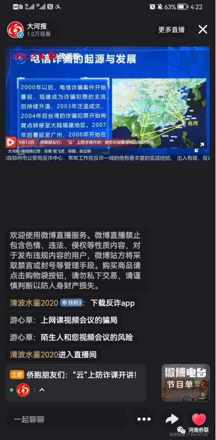 2022年9月13日,由河南省僑聯(lián)主辦,鄭州市公安局反詐中心、省僑聯(lián)權(quán)益保障部、大河報(bào)·豫視頻等共同承辦的首期“僑胞反詐知識(shí)大學(xué)堂”直播活動(dòng)在鄭舉行,邀請(qǐng)河南省防范打擊電信網(wǎng)絡(luò)詐騙犯罪專家相冰警官作主題講座,來自全球40余國(guó)家和地區(qū)的僑領(lǐng)僑胞、留學(xué)生、國(guó)內(nèi)歸僑僑眷,及省轄市政法、僑聯(lián)等部門干部職工5萬余人次在線參加此次講座。本次活動(dòng)通過“大河報(bào)·豫視頻”“大河看法”“反詐第一線”等新媒體矩陣同步直播,截止日前,直播收看量已破6萬人次,網(wǎng)友互動(dòng)留言千余條。