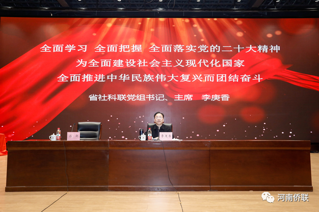 為深入學(xué)習(xí)貫徹黨的二十大精神,進(jìn)一步強(qiáng)化僑界思想引領(lǐng)、深化政治認(rèn)同。2月24日下午,河南省第十一次歸僑僑眷代表大會(huì)特別組織黨的二十大精神宣講報(bào)告會(huì),邀請(qǐng)省社科聯(lián)黨組書(shū)記、主席李庚香授課。報(bào)告會(huì)由省僑聯(lián)黨組成員、副主席候選人呂劍主持,在鄭參會(huì)的僑界代表、特邀嘉賓、海外顧問(wèn)等400余人均到場(chǎng)聆聽(tīng)。