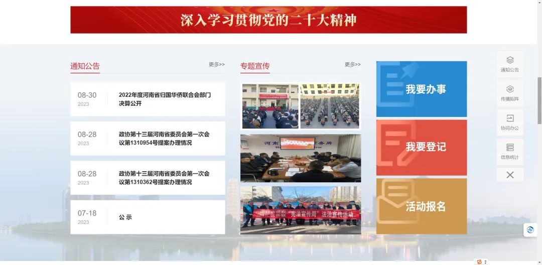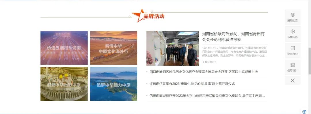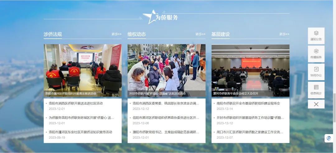 12月25日,河南省歸國(guó)華僑聯(lián)合會(huì)(簡(jiǎn)稱河南省僑聯(lián))新版首頁(yè)正式亮相!此次改版是省僑聯(lián)向提質(zhì)增效轉(zhuǎn)型邁出的重要一步,新版首頁(yè)以用戶需求為導(dǎo)向,界面更為簡(jiǎn)潔美觀、互動(dòng)更為頻繁及時(shí)、服務(wù)更為方便快捷。