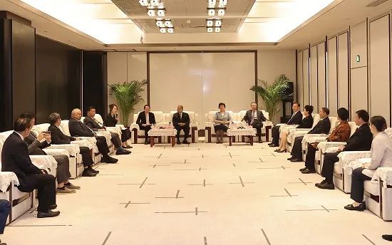 頒獎儀式開始前,萬立駿、王曉萍與受表彰的施恭旗先生及菲律賓華人經(jīng)貿(mào)代表團親切交流。