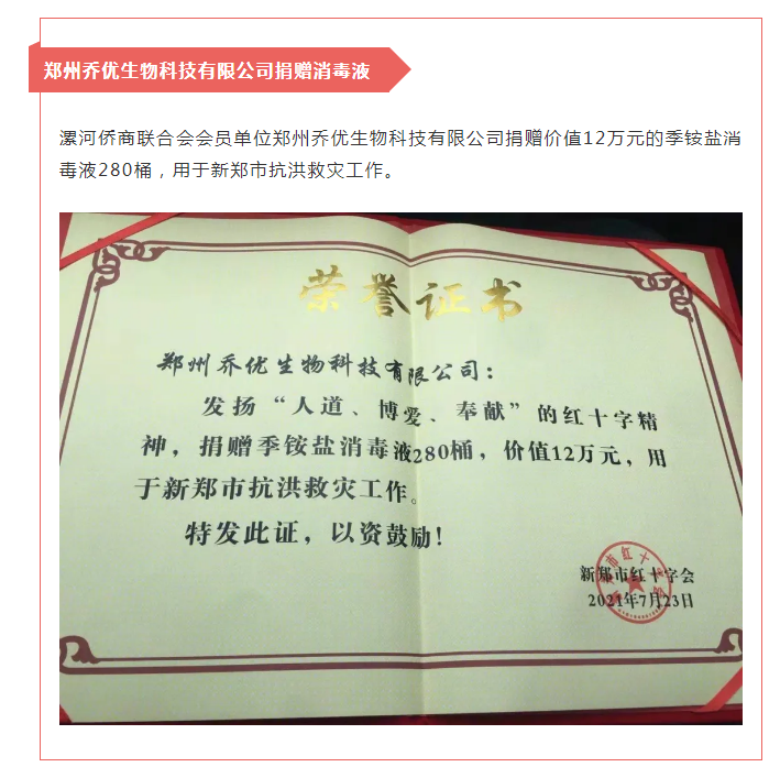 中國(guó)僑商聯(lián)合會(huì)會(huì)長(zhǎng)常務(wù)副會(huì)長(zhǎng)單位、正大集團(tuán)的控股企業(yè)中國(guó)生物制藥捐款500萬(wàn)元現(xiàn)金及價(jià)值500萬(wàn)元應(yīng)急救援物資,用于支援當(dāng)?shù)厝﹂_展緊急醫(yī)學(xué)救援,馳援河南抗災(zāi)防疫。