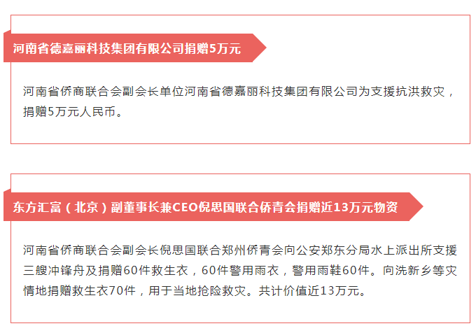 此外,全國(guó)僑商組織也積極捐贈(zèng)和援助,助力河南抗汛救災(zāi),向他們表示感謝、致敬!