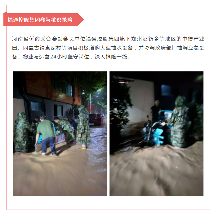 洪水無(wú)情,人間有愛!災(zāi)情發(fā)生之后,在省僑聯(lián)的指導(dǎo)下,河南省僑商會(huì)緊急啟動(dòng)抗汛救災(zāi)情況搜集登記工作,第一時(shí)間聯(lián)系走訪會(huì)員,了解企業(yè)受災(zāi)情況,收集企業(yè)需求,第一時(shí)間幫助解決生產(chǎn)生活中的問(wèn)題、送上商會(huì)的關(guān)心,并發(fā)出了《關(guān)于積極參與“風(fēng)雨同舟 共渡難關(guān)”抗汛救災(zāi)的倡議書》,積極倡導(dǎo)會(huì)員企業(yè)捐款捐物。
