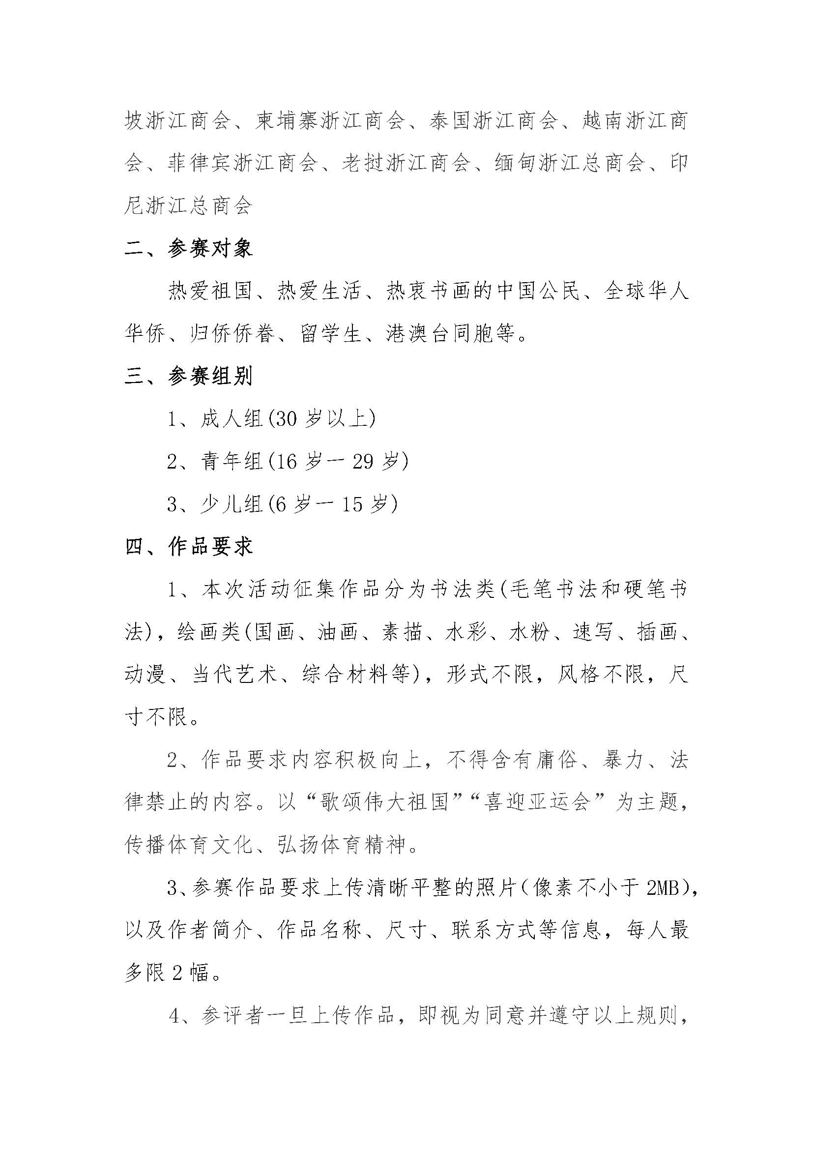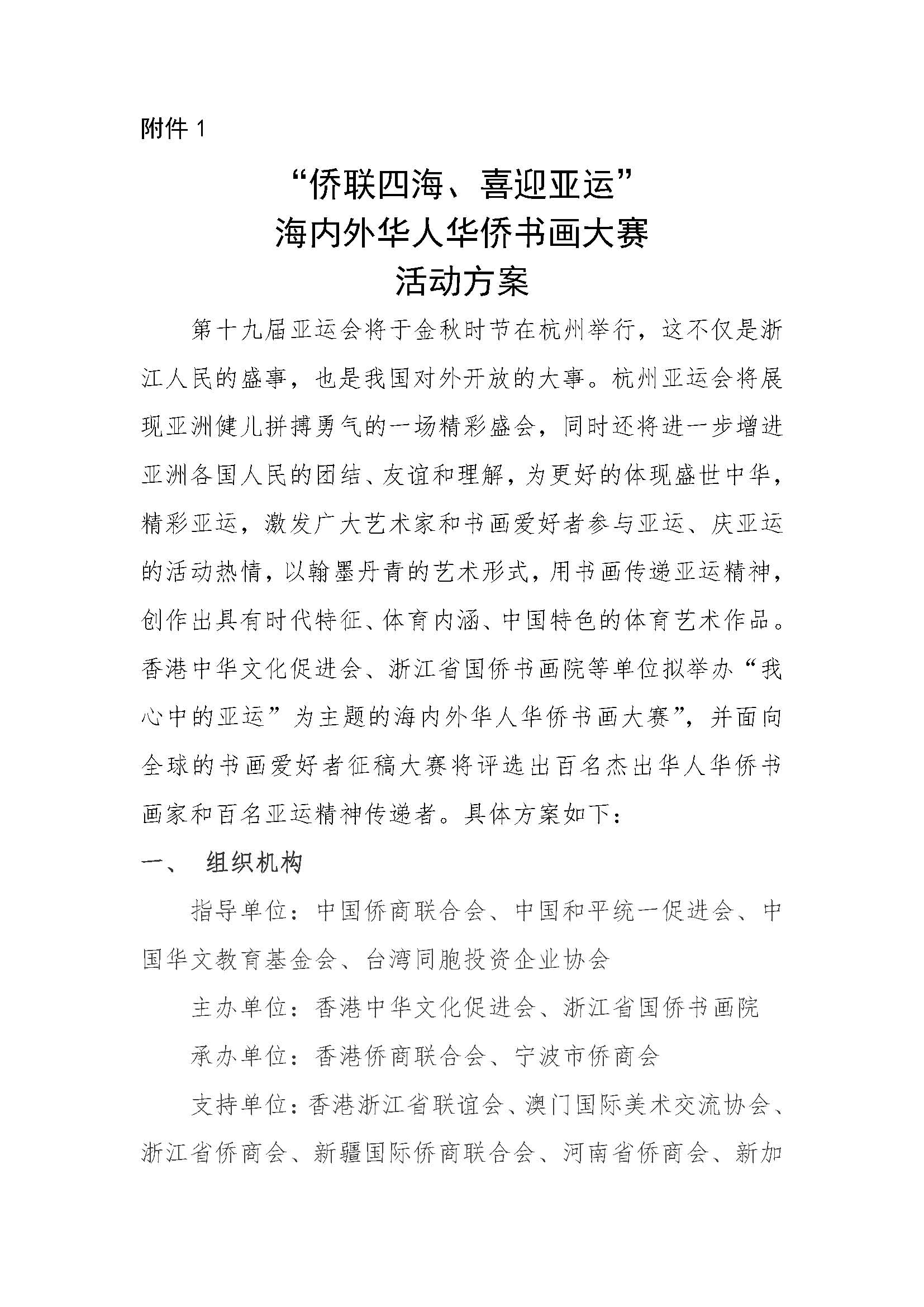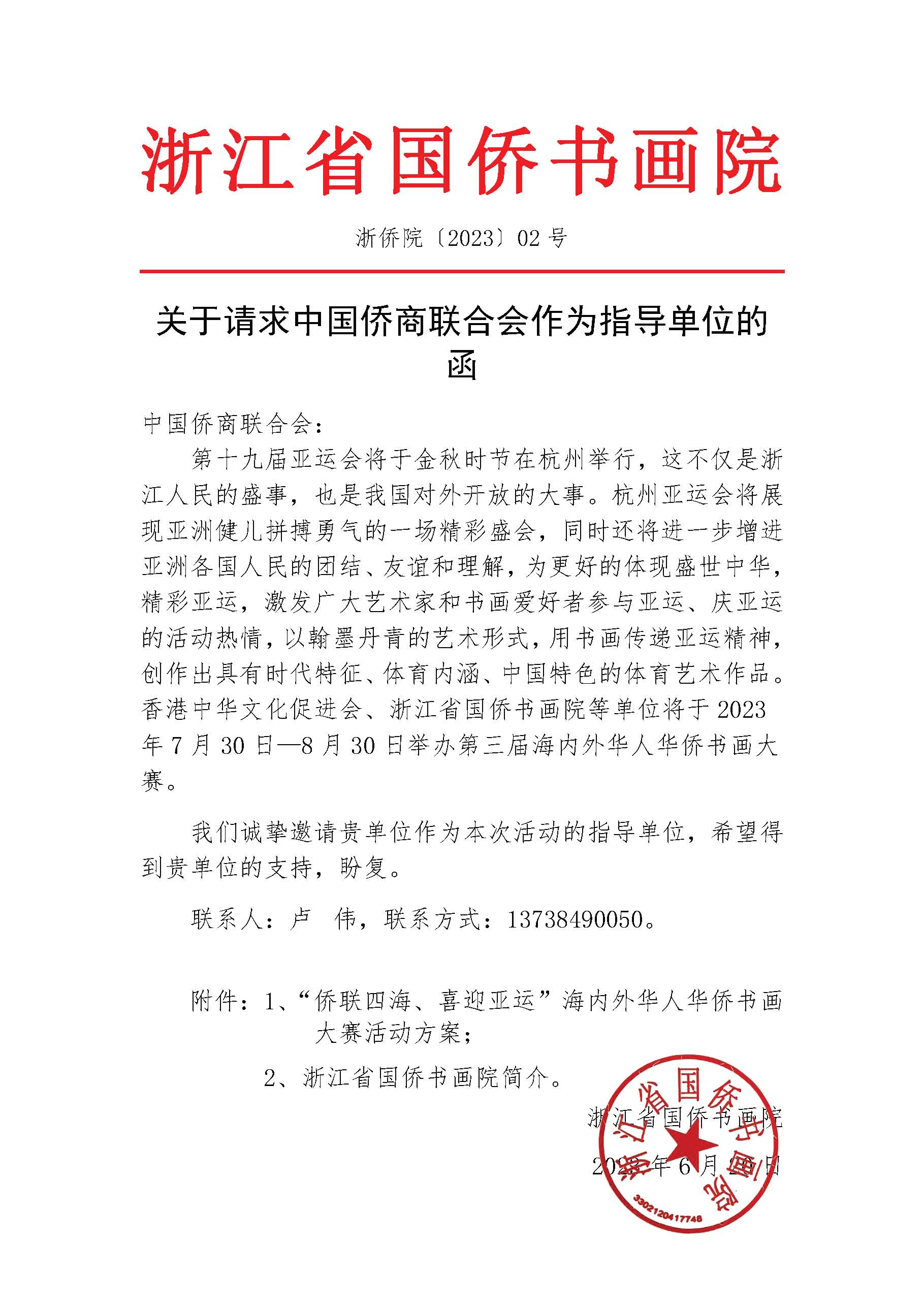 為更好地體現(xiàn)盛世中華、精彩亞運,激發(fā)廣大藝術家和書畫愛好者參與亞運、慶亞運的活動熱情,以翰墨丹青的藝術形式,用書畫傳遞亞運精神,創(chuàng)作出具有時代特征、體育內涵、中國特色的體育藝術作品,2023年7月30日—8月30日,第三屆海內外華人華僑書畫大賽將舉辦,大賽由香港中華文化促進會、浙江省國僑書畫院等單位主辦,由中國僑商聯(lián)合會等作為指導單位,我會及多家海內外商協(xié)會為本次大賽支持單位。此次大賽將面向全球的書畫愛好者,并評選出百名杰出華人華僑書畫家和百名亞運精神傳遞者。