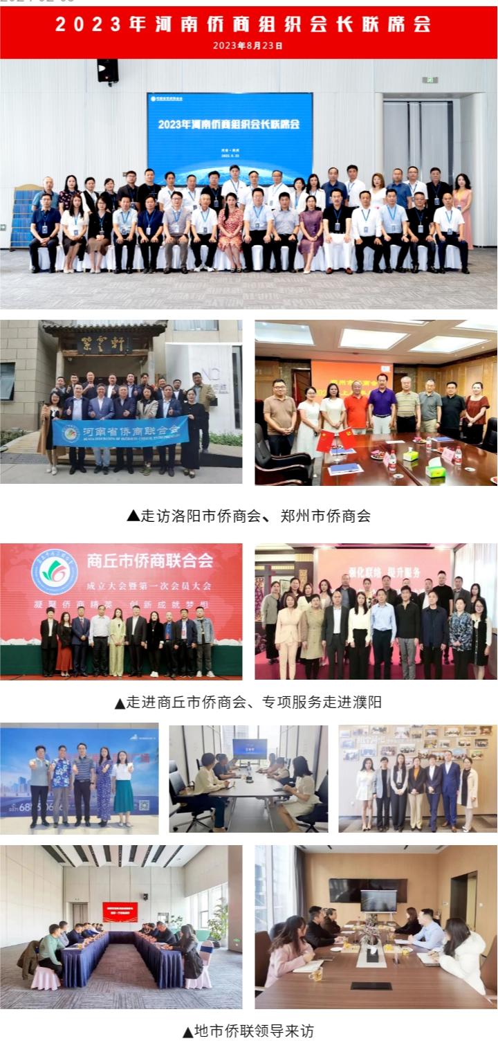 2023年,省僑商會(huì)積極響應(yīng)中國(guó)僑聯(lián)“全國(guó)僑務(wù)一盤棋”號(hào)召,努力搭建河南僑界一張網(wǎng)、一盤棋。特別策劃、組織了全省僑商組織會(huì)長(zhǎng)聯(lián)席會(huì),攜手18地市建立了18地市僑商組織聯(lián)絡(luò)機(jī)制。為了深化河南僑界一張網(wǎng)建設(shè),先后走訪鄭州、洛陽(yáng)、商丘、濮陽(yáng)僑商會(huì),將商會(huì)專項(xiàng)服務(wù)帶到地市;接待了南陽(yáng)、濮陽(yáng)、鶴壁、信陽(yáng)僑聯(lián)及溫縣統(tǒng)戰(zhàn)部來(lái)訪,了解地市僑商發(fā)展需求。通過(guò)這一年的努力,我們與各地市僑聯(lián)、僑商會(huì)的聯(lián)系更加緊密,省市僑商組織間的互動(dòng)更為頻繁,河南僑界的力量和聲音都更具聲勢(shì)與影響力。