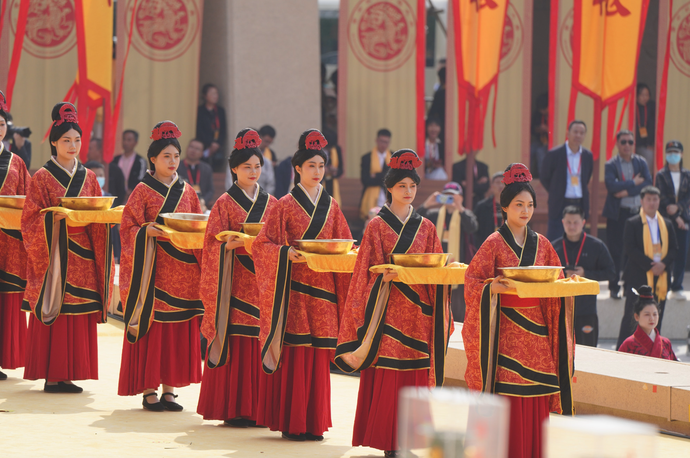 共拜始祖。現(xiàn)場(chǎng)全體人員面向黃帝像,莊嚴(yán)肅立,滿懷崇敬之情行施拜禮,深深三鞠躬。