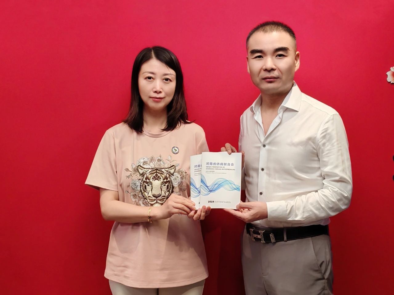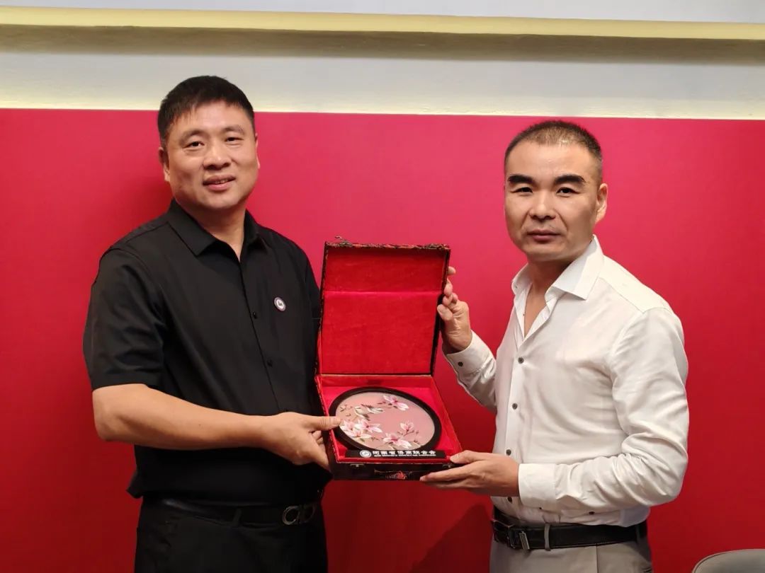 △省僑商會(huì)監(jiān)事長(zhǎng)鄭定輝代表河南省僑商聯(lián)合會(huì)為新加坡河南同鄉(xiāng)會(huì)送上河南特色禮物汴繡,新加坡河南同鄉(xiāng)會(huì)執(zhí)行會(huì)長(zhǎng)代表新加坡河南同鄉(xiāng)會(huì)接受禮物