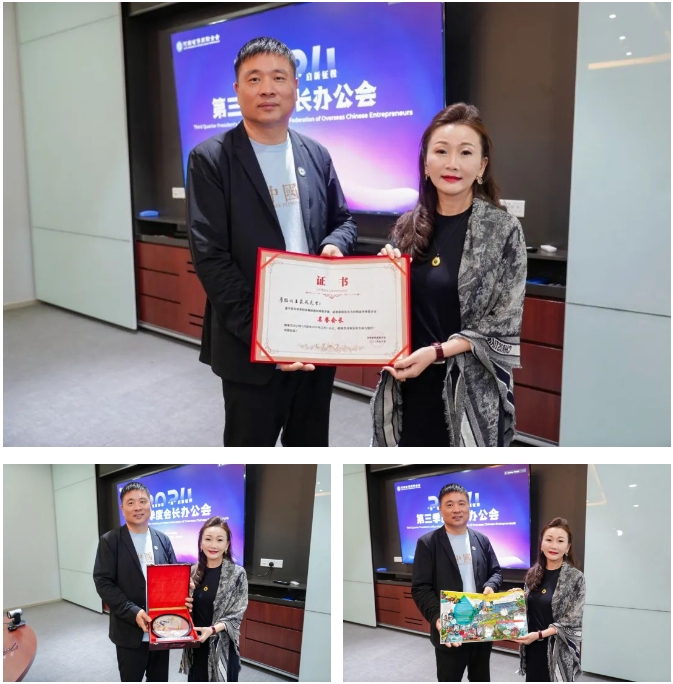 △省僑商會(huì)監(jiān)事長(zhǎng)鄭定輝代表河南省僑商聯(lián)合會(huì)為省僑商會(huì)名譽(yù)會(huì)長(zhǎng)、新加坡華源會(huì)會(huì)長(zhǎng)王泉成頒發(fā)證書,為新加坡華源會(huì)副會(huì)長(zhǎng)曾珍、衛(wèi)達(dá)仕律所業(yè)務(wù)部高級(jí)顧問徐澤光贈(zèng)送代表綠色健康的艾草餅;并為新加坡華源會(huì)送上河南特色禮物汴繡,曾珍代表華源會(huì)接受證書及禮物,并回贈(zèng)禮物