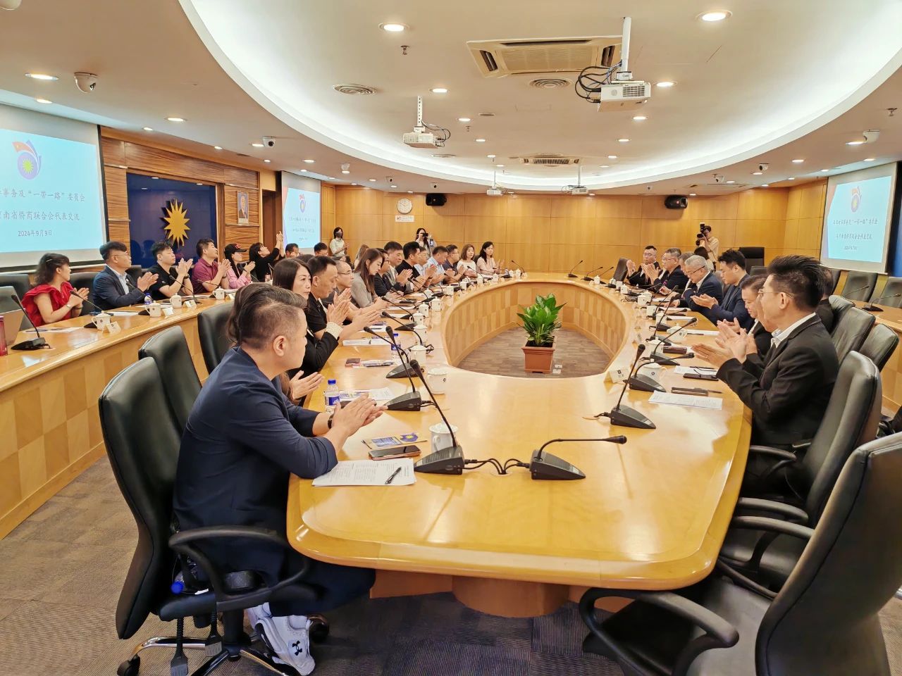 為了更深入地對(duì)接當(dāng)?shù)貎S商組織,為會(huì)員企業(yè)在海外發(fā)展時(shí)提供在地支持,9月9日上午大會(huì)開(kāi)幕前夕,在監(jiān)事長(zhǎng)鄭定輝、執(zhí)行會(huì)長(zhǎng)陳向輝的帶隊(duì)下,省僑商會(huì)一行近30人走進(jìn)馬來(lái)西亞豫商聯(lián)合會(huì),與馬來(lái)西亞豫商聯(lián)合會(huì)進(jìn)行座談交流,正式拉開(kāi)了“中原僑商海外行·馬來(lái)西亞站”活動(dòng)的序幕。馬來(lái)西亞豫商聯(lián)合會(huì)會(huì)長(zhǎng)曹峰、秘書(shū)長(zhǎng)張華等親切接待,座談?dòng)蓮埲A主持。