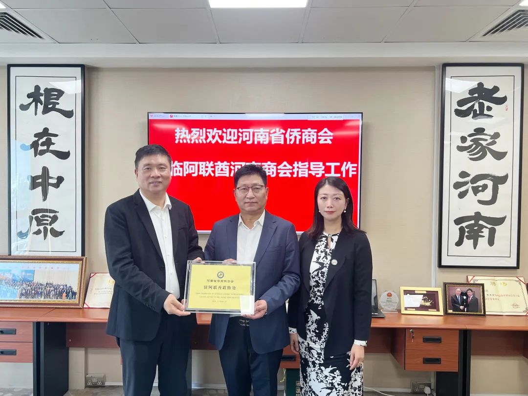 阿聯(lián)酋河南商會暨同鄉(xiāng)會會長胡歡迎攜常務副會長梁小濤、王平、鹿鳴、舒曉飛、高建勛、雷雨霖、李康等熱情接待。在胡會長的帶領下,大家參觀了阿聯(lián)酋河南商會暨同鄉(xiāng)會的會址,了解了商會的情況。雙方進行了座談交流。