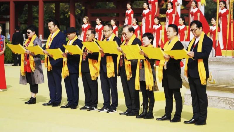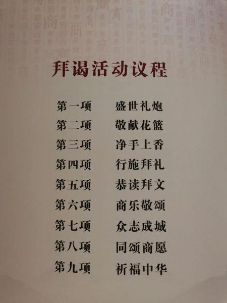 拜謁儀式共有九項(xiàng):盛世禮炮、敬獻(xiàn)花籃、凈手上香、行施拜禮、恭讀拜文、商樂敬頌、眾志成城、同頌商愿、祈福中華。