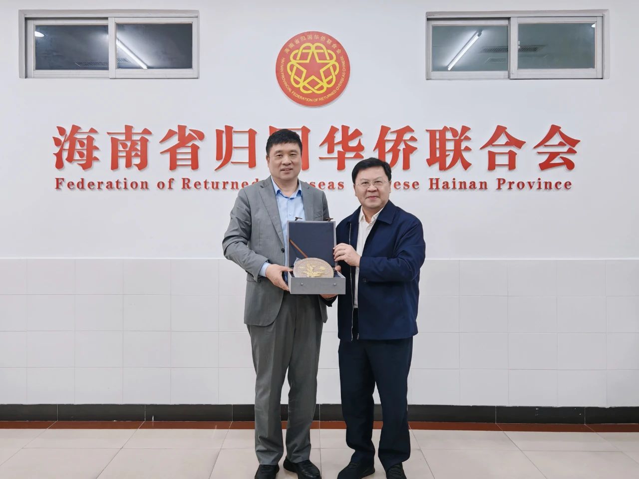 會后,我會會長鄭定輝為海南省僑聯(lián)贈送商會禮物,雙方共同合影留念。