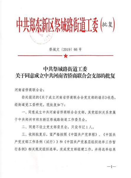 祭城路街道辦事處黨建辦主任韓超首先宣讀《中共祭城路街道工委關(guān)于同意成立中共河南省僑商聯(lián)合會支部的批復(fù)》文件,并表示,經(jīng)街道黨工委研究,同意省僑商會成立中共河南省僑商聯(lián)合會支部,其黨組織關(guān)系隸屬于中共鄭州市鄭東新區(qū)祭城路街道工作委員會。