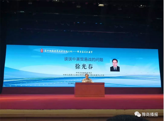 ▲河南省委原書(shū)記徐光春同志作題為《談?wù)勚忻蕾Q(mào)易戰(zhàn)的問(wèn)題》的演講,為廣大豫商解讀形勢(shì)、指明方向