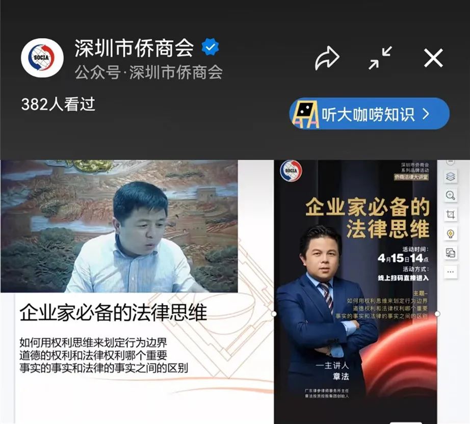 4月15日下午,深圳市僑商會與廣東律參律師事務(wù)所聯(lián)合舉辦的“僑商法律大講堂”線上開講。包括本會會員企業(yè)家、企業(yè)員工在內(nèi)的400多人參與線上活動。