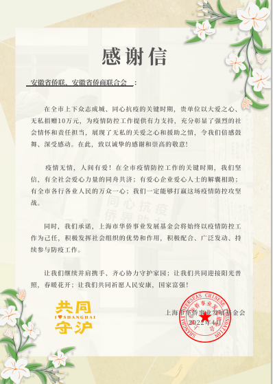 4月15日,上海市僑聯(lián)通過上海市華僑事業(yè)發(fā)展基金會發(fā)來《捐贈證書》和《感謝信》,感謝安徽省僑聯(lián)、安徽省僑商聯(lián)合會“在全市上下眾志成城、同心抗疫的關鍵時期,以大愛之心、無私捐贈10萬元人民幣,為疫情防控工作提供有力支持,充分彰顯了強烈的社會情懷和責任擔當,展現(xiàn)了無私的關愛之?和援助之情……。”