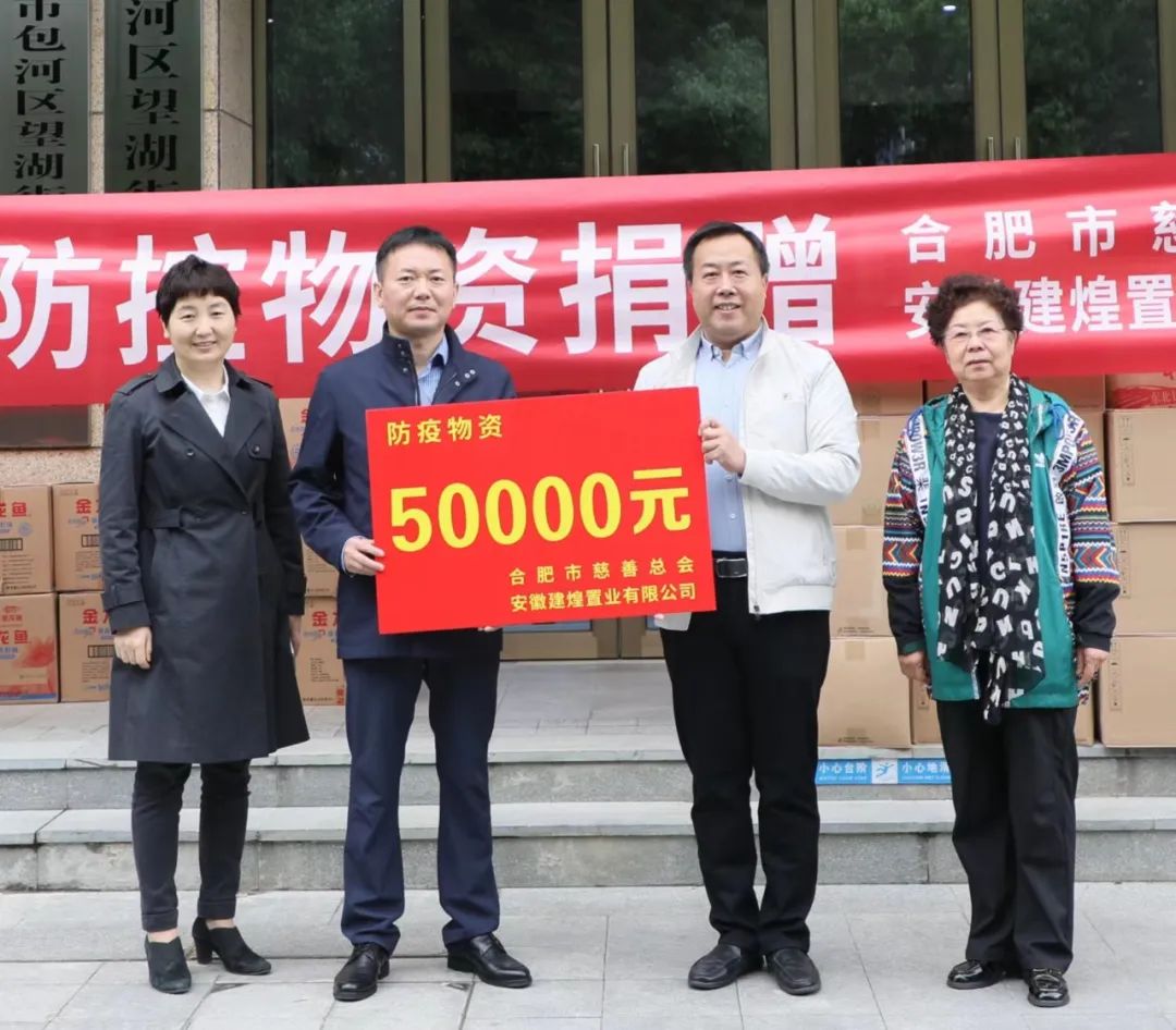 4月29日,集團子公司安徽建煌置業(yè)有限公司勇于擔當,回饋社會,與社區(qū)并肩抗疫,向合肥市包河區(qū)望湖街道捐贈了價值50000元的生活防疫物資,以實際行動助力社區(qū)疫情防控工作。望湖街道副書記崔效工代表街道感謝僑商企業(yè)為社區(qū)疫情防控送來的支援和慰問。