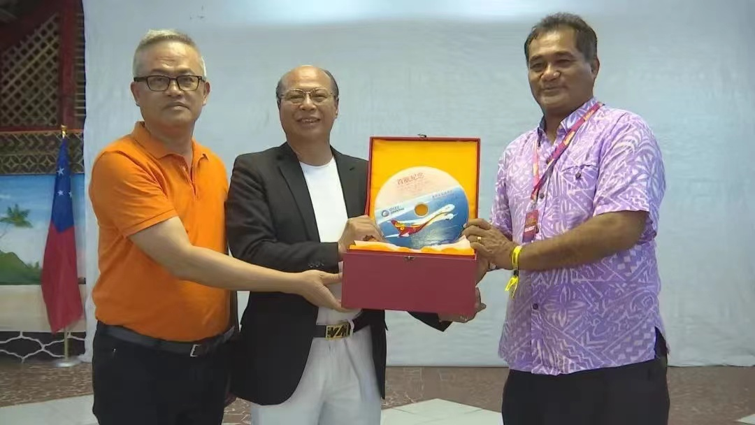 商會(huì)代表名譽(yù)會(huì)長鐘保加(中)、理事長潘家森(左)與薩摩亞政府代表(右)交換紀(jì)念品
