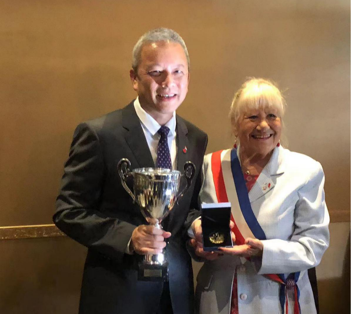 法國巴黎十九區(qū)副市長若伊斯·瑪萊女士(Royce Malai)代表巴黎市長安娜.伊達爾戈女士(Anne Hidalgo)向丁林洪先生頒發(fā)“巴黎榮譽市民”勛章和杰出貢獻獎。