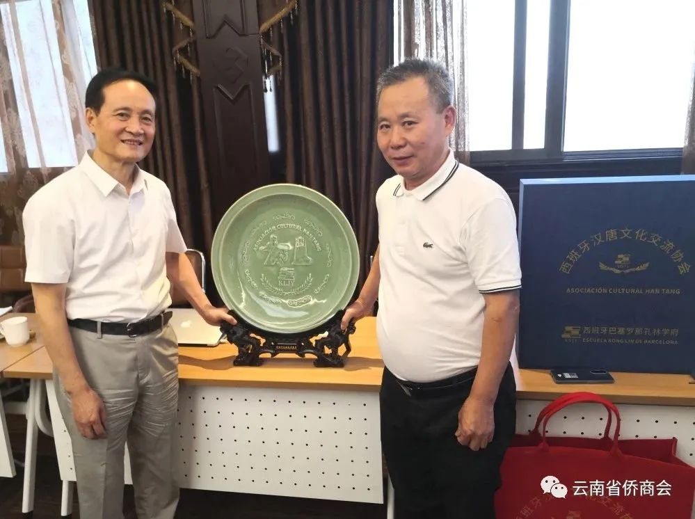 調(diào)研活動結(jié)束時,立足歐洲傳播中華文化的林為華會長,親手將“西班牙漢唐文化交流協(xié)會”紀(jì)念盤,贈與僑商會尹元江會長。