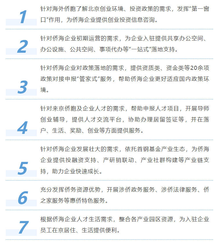 北京僑海創(chuàng)業(yè)投資發(fā)展服務中心將聚焦海外華人華僑來京創(chuàng)業(yè)、投資、發(fā)展的實際需求,依托現(xiàn)有投資服務和人才服務工作體系,以“北京僑夢苑”(首鋼園區(qū))為基地,充分發(fā)揮首鋼基金在空間、設施、投資、孵化運營等方面優(yōu)勢,著力為來京創(chuàng)新創(chuàng)業(yè)僑胞提供七大類服務: