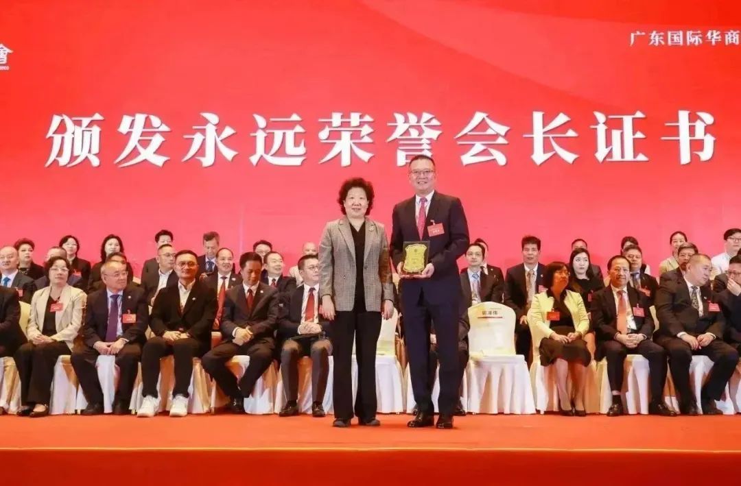 廣東省政協(xié)副主席李心為永遠(yuǎn)榮譽(yù)會(huì)長郭澤偉頒發(fā)證書