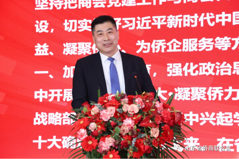 他指出:全省各級僑聯(lián)組織,堅持以習近平新時代中國特色社會主義思想為指導,深入學習貫徹習近平總書記關于僑務工作、群團工作的重要論述,錨定“走在前、開新局”,堅持“兩個并重”,深化“兩個拓展”,推動“兩個建設”,把服務推動僑商創(chuàng)新創(chuàng)業(yè)工作擺在突出位置,認真踐行“以人為本、為僑服務”宗旨,不斷強化思想政治引領、搶抓重大戰(zhàn)略機遇、創(chuàng)新拓展文化交流、精準開展為僑服務,打造了“創(chuàng)業(yè)中華·興業(yè)齊魯”“服務雙招雙引、服務外資外貿(mào)、服務僑商僑企”“僑聚齊魯”“鄉(xiāng)村振興僑界力量”等一大批特色工作品牌,引導和推動包括僑商在內(nèi)的廣大海內(nèi)外僑胞,積極投身山東建設、服務山東發(fā)展。山東省僑商會立要足商會職能,不斷創(chuàng)新工作舉措,秉持“服務、創(chuàng)新、發(fā)展、貢獻”的宗旨,服務山東發(fā)展大局,服務會員成長發(fā)展,充分發(fā)揮僑商企業(yè)在推動自主創(chuàng)新、產(chǎn)業(yè)升級、區(qū)域協(xié)調(diào)發(fā)展以及民間外交等方面的積極作用,大力推動山東省新舊動能轉換,努力把商會辦成“行為規(guī)范、服務周到、形象良好、會員滿意”的“僑商之家”。他強調(diào):下一步,全省各級僑聯(lián)組織要切實發(fā)揮好橋梁紐帶作用,最大限度引領凝聚廣大僑界群眾,聚焦同圓共享中國夢這一主題,突出服務山東高質量發(fā)展,既要積極宣傳好山東的發(fā)展優(yōu)勢,更要實實在在聯(lián)系服務好僑界群眾,特別是要千方百計為廣大僑商創(chuàng)新創(chuàng)業(yè)排憂解難,不斷營造我省一流的創(chuàng)新創(chuàng)業(yè)環(huán)境,切實推動“僑聚齊魯”,不斷助力“圓夢山東”。他希望:山東省僑商聯(lián)合會增強政治認同,爭做習近平新時代中國特色社會主義思想的堅定擁護者。做堅守主業(yè)實業(yè),爭做山東高質量發(fā)展的積極參與者。做發(fā)揮特色優(yōu)勢,爭做山東高水平對外開放的大力推動者。全省各級僑聯(lián)組織要發(fā)揮內(nèi)外聯(lián)系廣泛的優(yōu)勢,發(fā)揮橋梁紐帶作用,牢記習近平總書記對山東“走在前、開新局”的殷切囑托,團結引領廣大僑界群眾,發(fā)揮獨特優(yōu)勢,凝心聚力、奮發(fā)有為,持續(xù)發(fā)力、久久為功,把愛鄉(xiāng)之情、報國之志轉化為投身祖國建設、推動山東發(fā)展的實際行動,為奮力譜寫中國式現(xiàn)代化山東篇章貢獻僑界力量、展現(xiàn)僑界擔當。