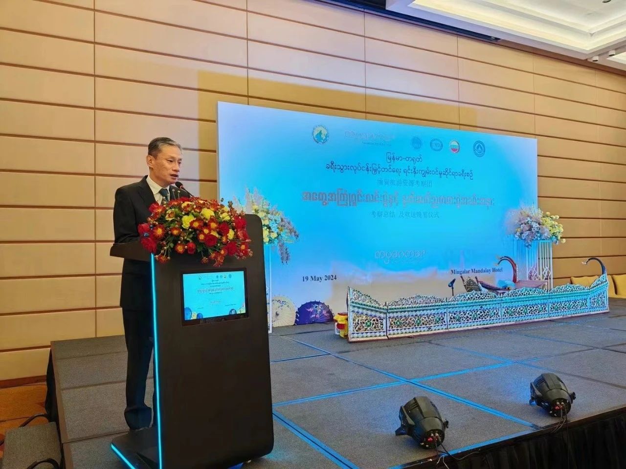 2024年5月19日晚,中國駐曼德勒總領(lǐng)事館總領(lǐng)事陳辰出席緬甸旅游資源考察團考察總結(jié)及歡送晚宴。緬甸酒店與旅游部部長德德凱、曼德勒省省長吳繆昂、緬甸旅游聯(lián)合會會長吳仰溫、中緬旅游協(xié)會負責(zé)人與考察團共同聯(lián)歡。