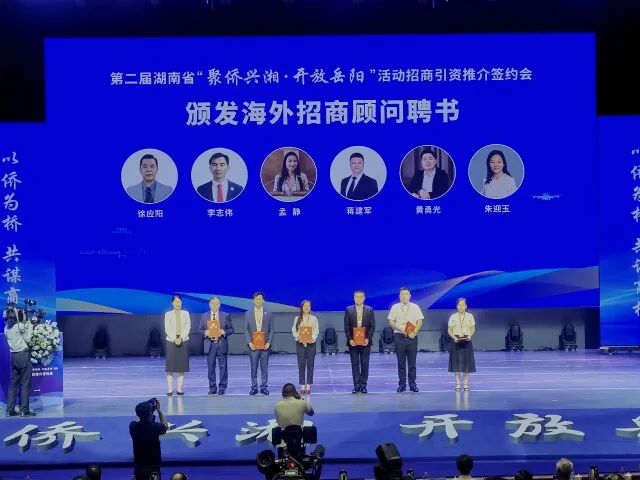 (5月30日上午,岳陽(yáng)市為6位海外招商顧問頒發(fā)聘書。)