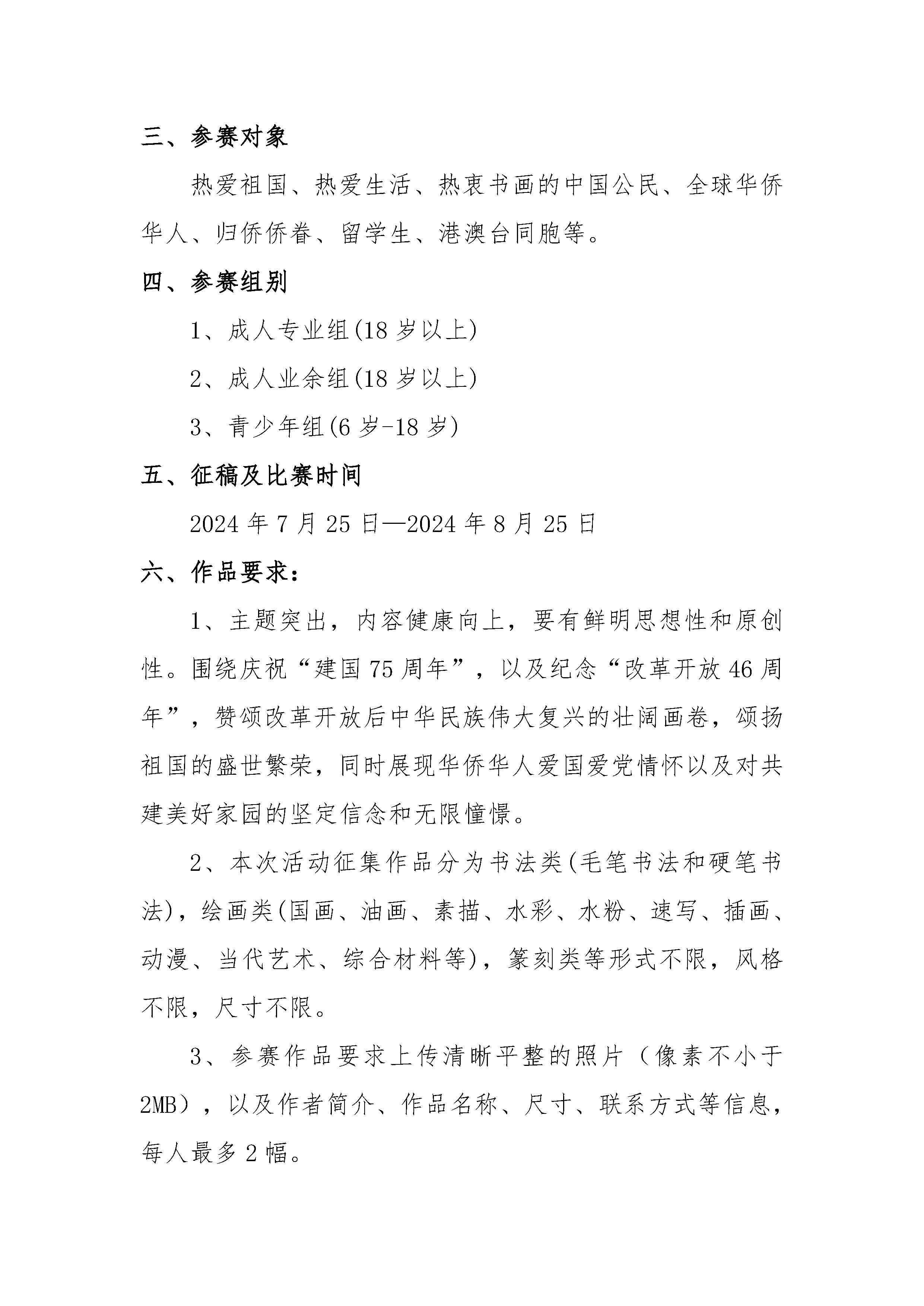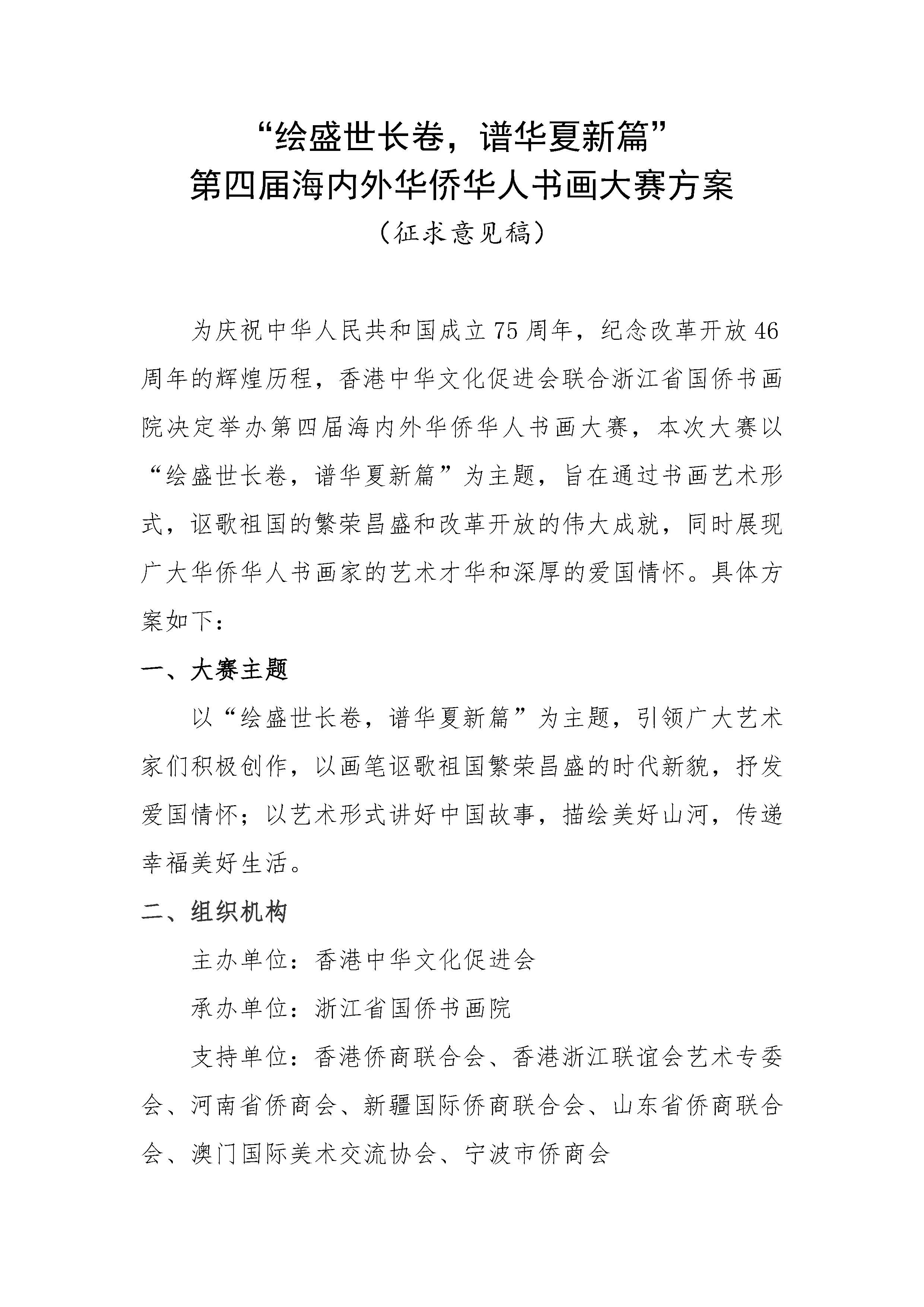 為慶祝中華人民共和國(guó)成立75周年,紀(jì)念改革開(kāi)放46周年的輝煌歷程,2024年7月25日—2024年8月25日,第四屆海內(nèi)外華僑華人書(shū)畫(huà)大賽即將舉辦,大賽由香港中華文化促進(jìn)會(huì)主辦、浙江省國(guó)僑書(shū)畫(huà)院承辦,我會(huì)及多家海內(nèi)外商協(xié)會(huì)為本次大賽支持單位。