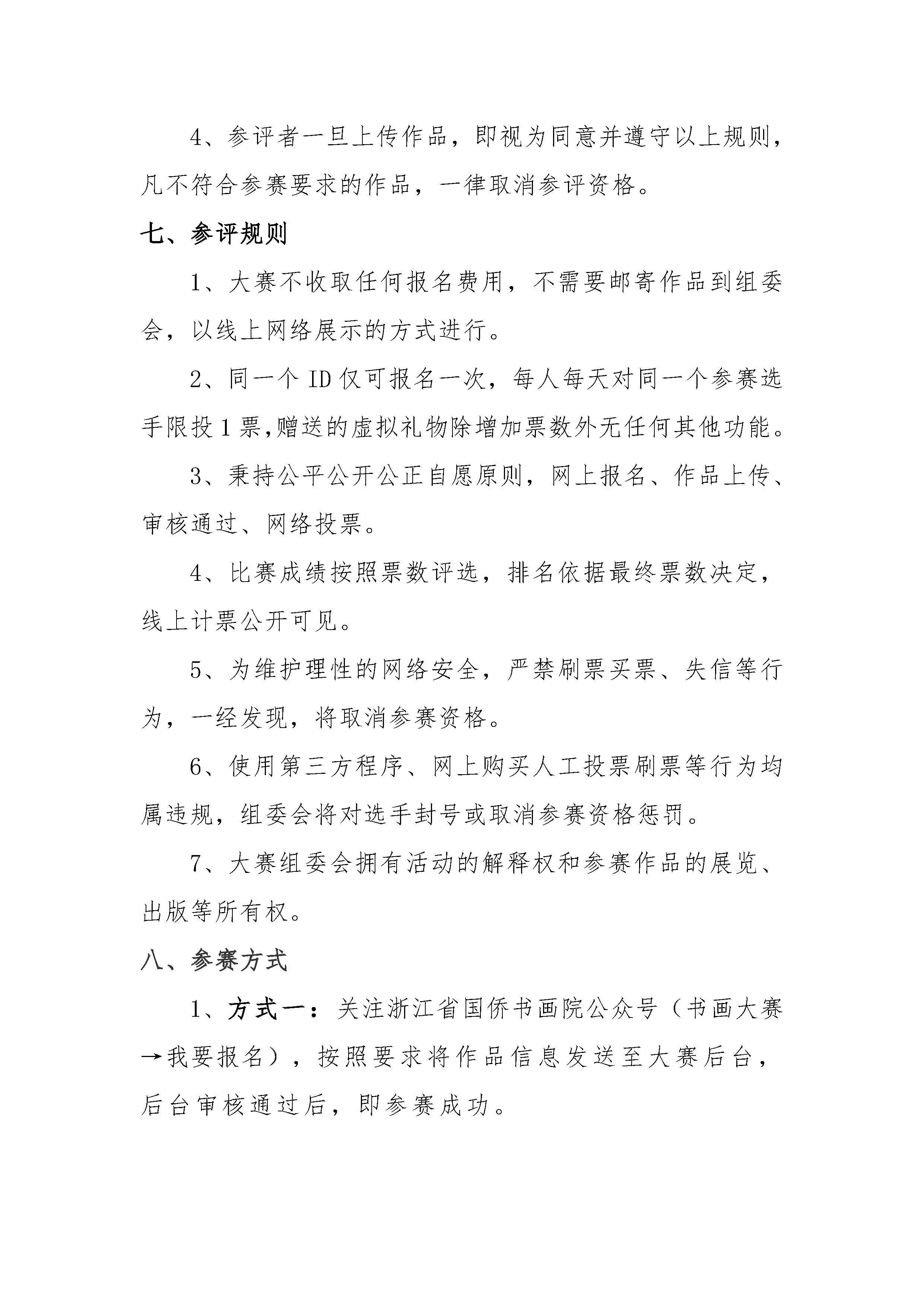 方式一:關(guān)注浙江省國(guó)僑書(shū)畫(huà)院公眾號(hào)(書(shū)畫(huà)大賽→我要報(bào)名),按照要求將作品信息發(fā)送至大賽后臺(tái),后臺(tái)審核通過(guò)后,即參賽成功。