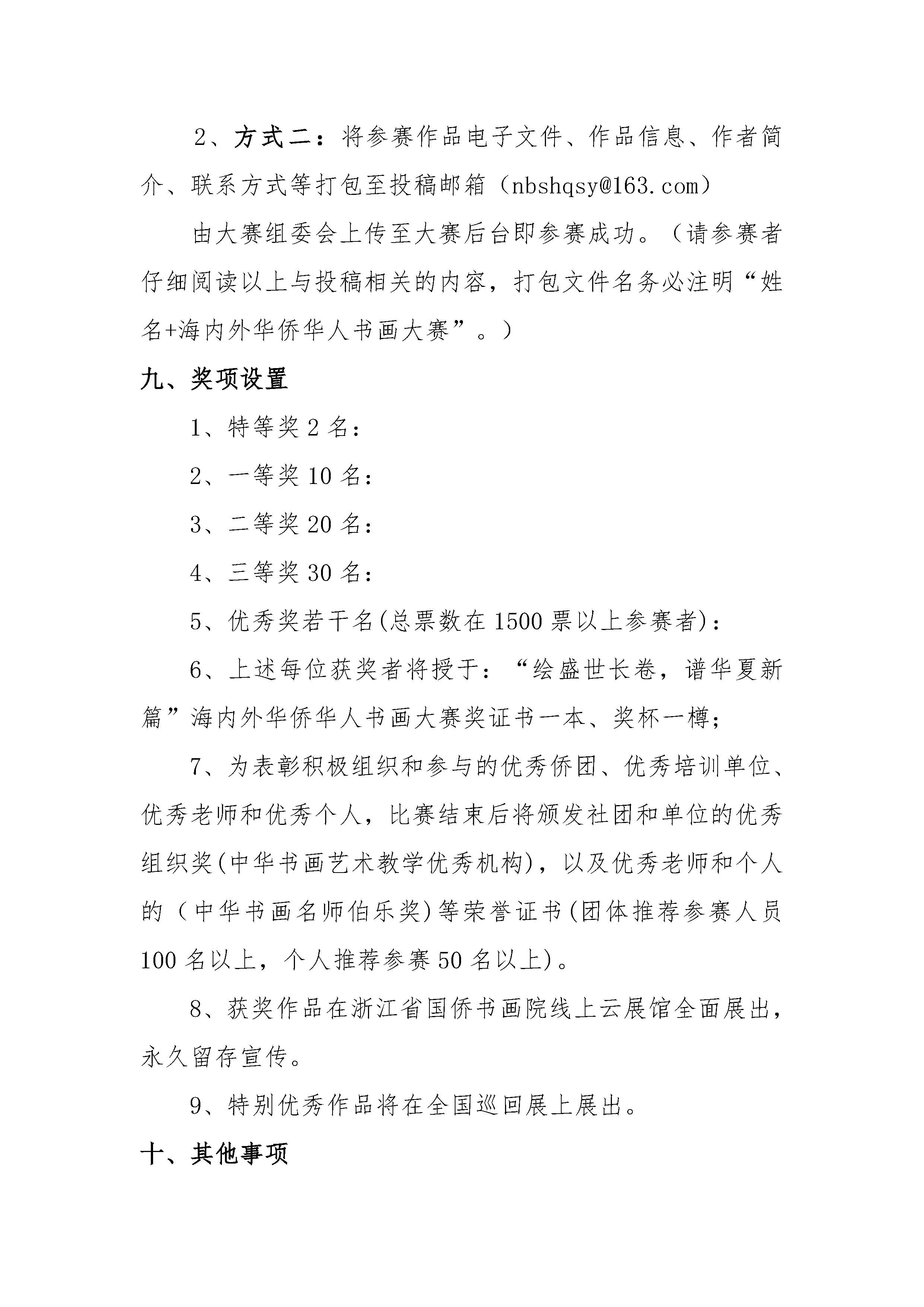 方式二:將參賽作品電子文件、作品信息、作者簡(jiǎn)介、聯(lián)系方式等打包至投稿郵箱([email protected])由大賽組委會(huì)上傳至大賽后臺(tái)即參賽成功。(請(qǐng)參賽者仔細(xì)閱讀以上與投稿相關(guān)的內(nèi)容,打包文件名務(wù)必注明“姓名+海內(nèi)外華僑華人書(shū)畫(huà)大賽”。)
