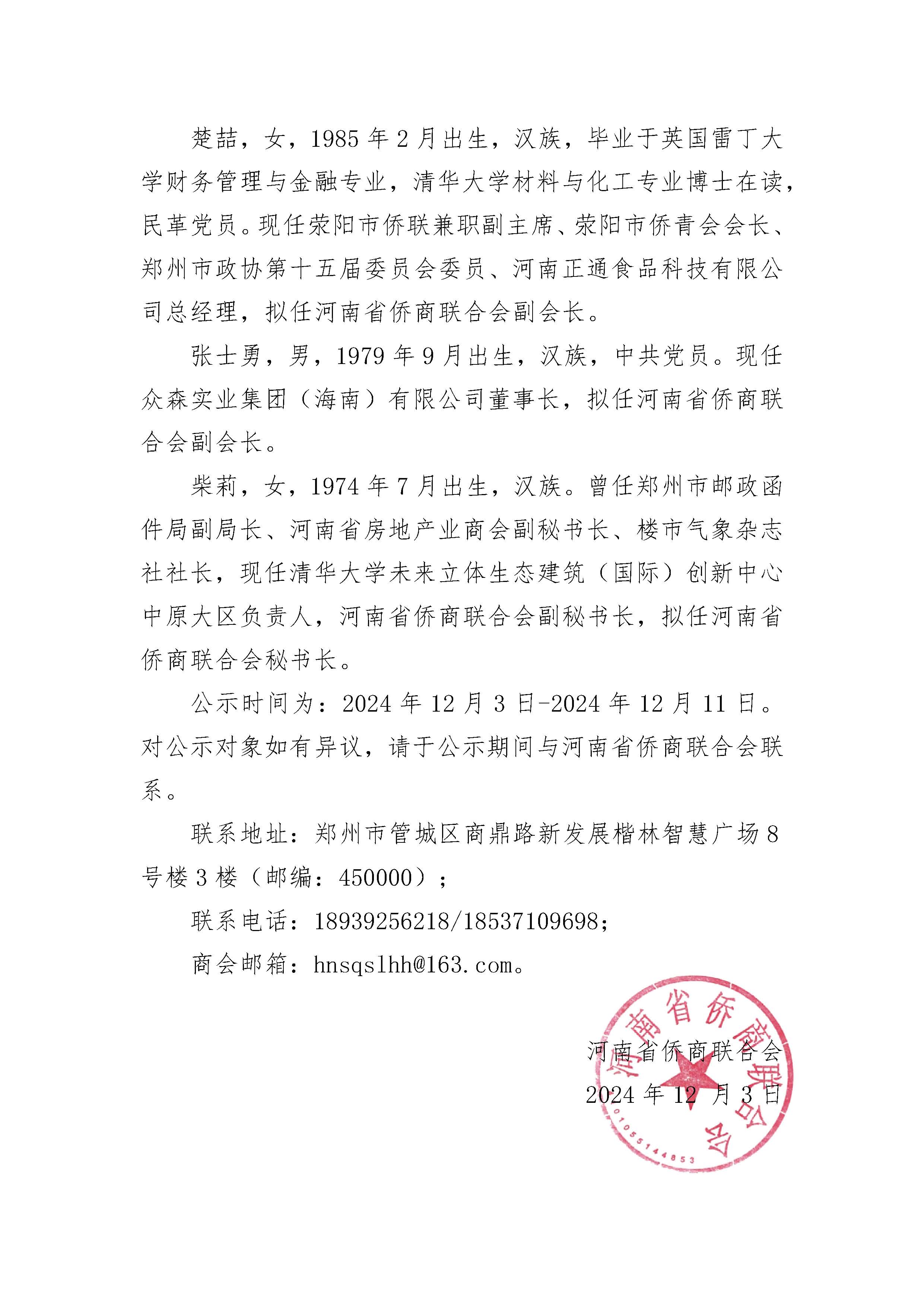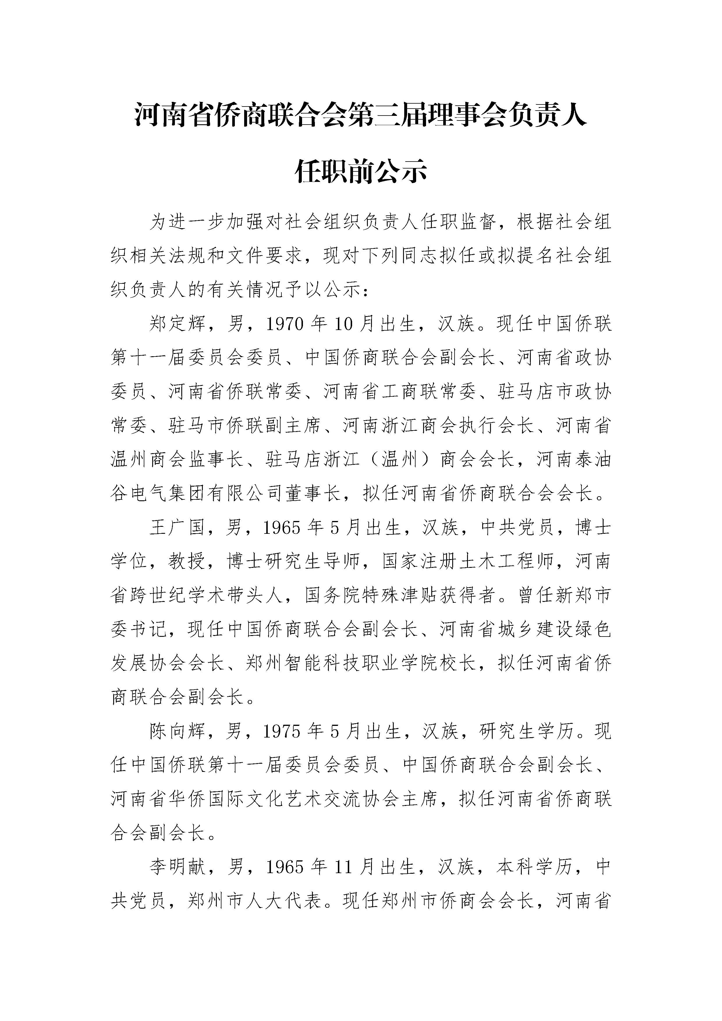 河南省僑商聯(lián)合會第三屆理事會負(fù)責(zé)人任職前公示