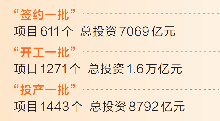 “開工一批”項(xiàng)目1271個,總投資1.6萬億元,年度目標(biāo)6896億元。其中,投資額30億元以上的107個、50億元以上的57個、100億元以上的21個;先進(jìn)制造業(yè)項(xiàng)目701個、總投資9065億元、年度目標(biāo)3986億元,現(xiàn)代服務(wù)業(yè)項(xiàng)目137個、總投資1841億元、年度目標(biāo)757億元,重大基礎(chǔ)設(shè)施項(xiàng)目126個、總投資1962億元、年度目標(biāo)729億元,社會民生項(xiàng)目122個、總投資1125億元、年度目標(biāo)503億元,新型城鎮(zhèn)化項(xiàng)目82個、總投資1127億元、年度目標(biāo)499億元,數(shù)字經(jīng)濟(jì)項(xiàng)目65個、總投資530億元、年度目標(biāo)282億元。