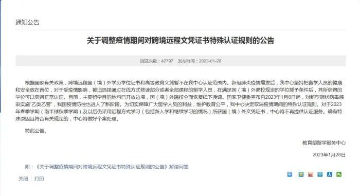 為切實保障廣大留學人員的利益,維護教育公平,教育部留學服務中心決定取消疫情期間的特殊認證規(guī)則。對于2023年春季學期(南半球秋季學期)及以后仍采用遠程方式學習(包括新入學和繼續(xù)學習的情況)所獲國(境)外文憑證書,將不再提供認證服務。確有特殊原因且符合有關規(guī)定的,將做好個案處理。