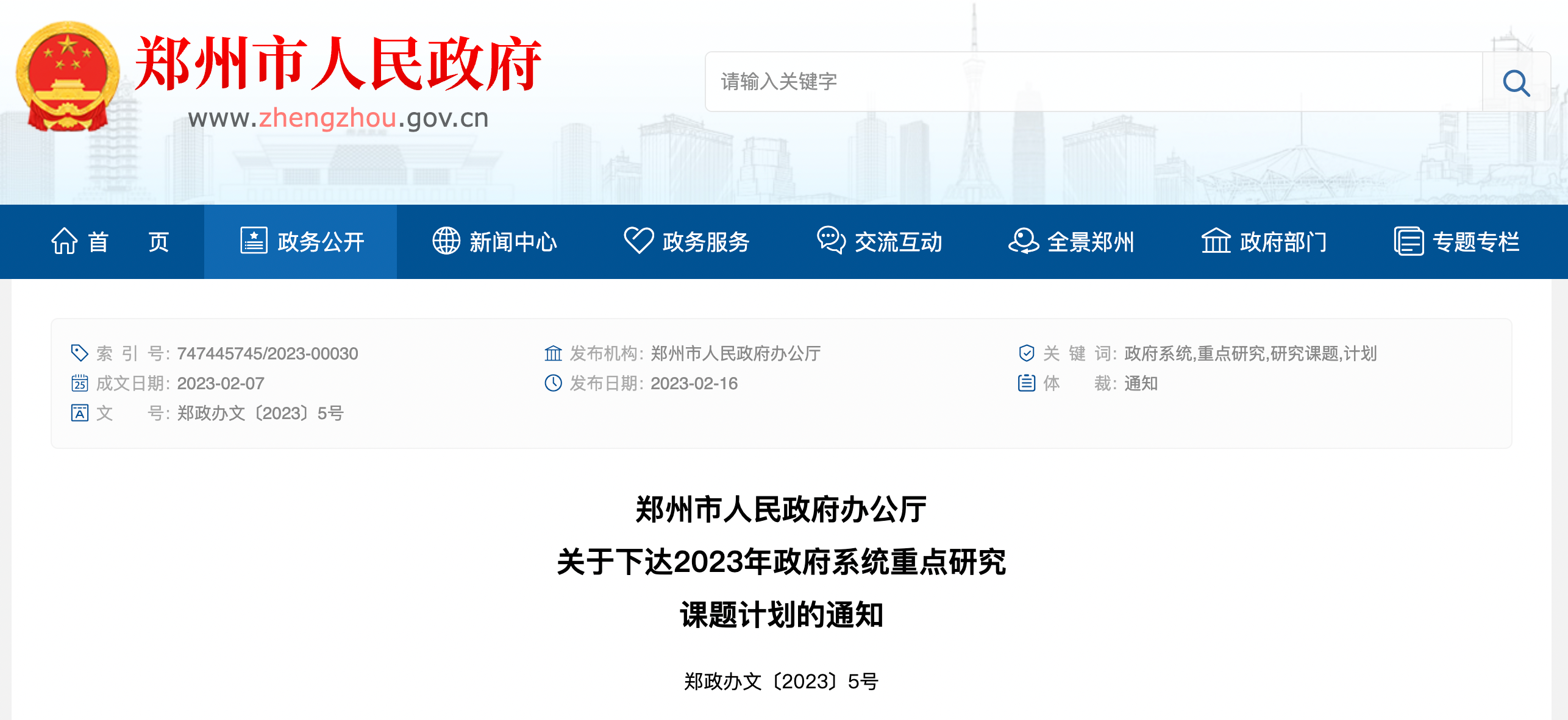 2月17日,大河財(cái)立方記者獲悉,鄭州市人民政府辦公廳近日發(fā)布《關(guān)于下達(dá)2023年政府系統(tǒng)重點(diǎn)研究課題計(jì)劃的通知》。