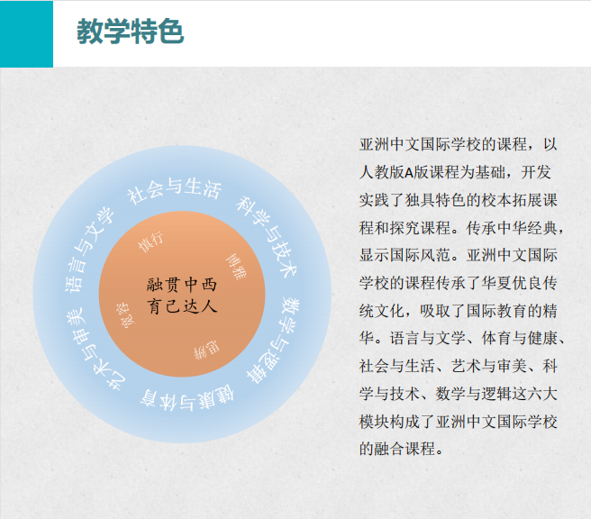 亞洲中文國際學(xué)校的課程,以強(qiáng)化中英文雙語為起點(diǎn)、以人教版A版課程為基礎(chǔ),開發(fā)實(shí)踐獨(dú)具特色的校本拓展課程和探究課程,傳承中華經(jīng)典,顯示國際風(fēng)范。