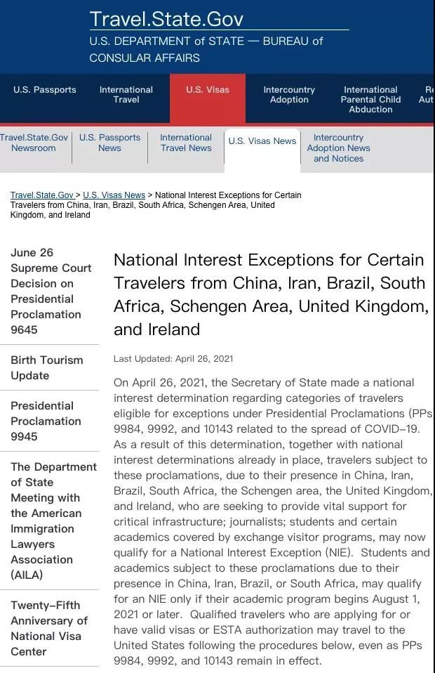 新規(guī)下,來自上述國家和地區(qū)的人員若希望在美國的關(guān)鍵基建領(lǐng)域提供支持,或從事記者職業(yè),或?yàn)榱魧W(xué)生和訪問學(xué)者,那么他們將符合“國家利益豁免條件”(National Interest Exception,簡稱NIE),被允許入境來美。
