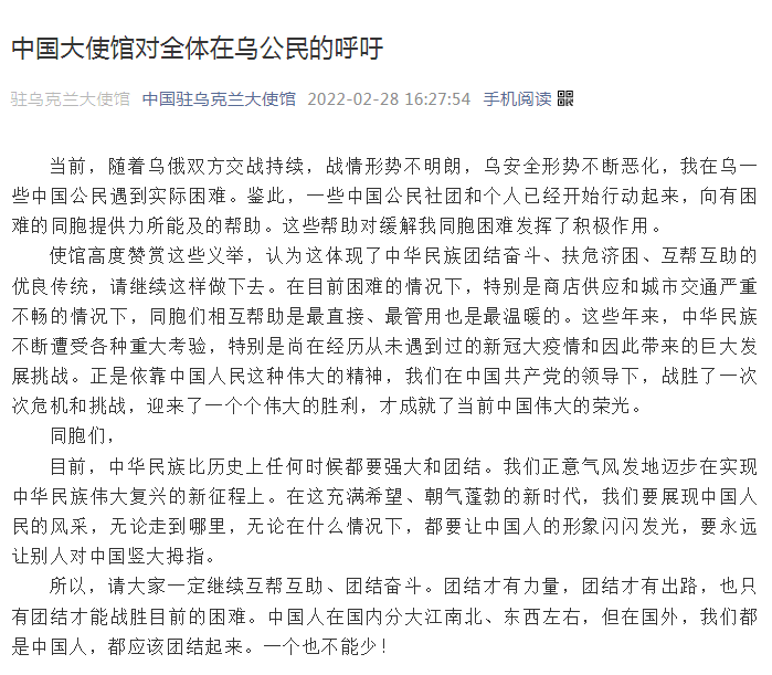 2月28日,駐烏克蘭大使館對全體在烏中國公民發(fā)出呼吁。使館表示,當(dāng)前,隨著烏俄雙方交戰(zhàn)持續(xù),戰(zhàn)情形勢不明朗,烏克蘭的安全形勢不斷惡化,一些在烏中國公民遇到了實(shí)際困難。鑒此,一些中國公民社團(tuán)和個人已經(jīng)開始行動起來,向有困難的同胞提供力所能及的幫助。這些幫助對緩解同胞的困難發(fā)揮了積極作用。