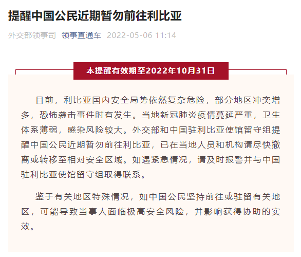據(jù)外交部領(lǐng)事司微信公眾號(hào)“領(lǐng)事直通車”消息,目前,利比亞國(guó)內(nèi)安全局勢(shì)依然復(fù)雜危險(xiǎn),部分地區(qū)沖突增多,恐怖襲擊事件時(shí)有發(fā)生。當(dāng)?shù)匦鹿诜窝滓咔槁訃?yán)重,衛(wèi)生體系薄弱,感染風(fēng)險(xiǎn)較大。外交部和中國(guó)駐利比亞使館留守組提醒中國(guó)公民近期暫勿前往利比亞,已在當(dāng)?shù)厝藛T和機(jī)構(gòu)請(qǐng)盡快撤離或轉(zhuǎn)移至相對(duì)安全區(qū)域。如遇緊急情況,請(qǐng)及時(shí)報(bào)警并與中國(guó)駐利比亞使館留守組取得聯(lián)系。