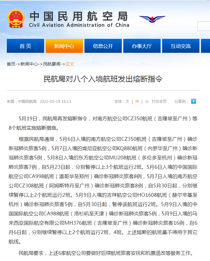 5月9日入境的中國國際航空公司CA988航班(洛杉磯至天津)確診新冠肺炎旅客5例,5月9日入境的馬來西亞國際航空有限公司MH376航班(吉隆坡至廣州)確診新冠肺炎旅客16例,自6月6日起,分別繼續(xù)暫停以上2個航班運(yùn)行2班、4班。上述熔斷的航班量不得用于其它航線。