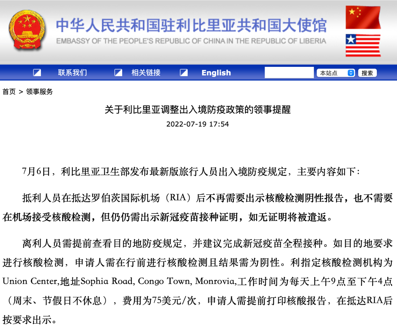 據(jù)中國(guó)駐利比里亞大使館消息,7月6日,利比里亞衛(wèi)生部發(fā)布最新版旅行人員出入境防疫規(guī)定,主要內(nèi)容如下: