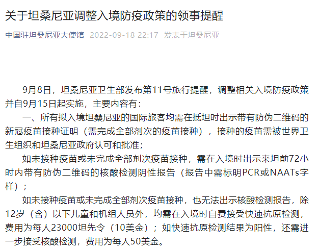 據(jù)中國駐坦桑尼亞大使館消息,9月8日,坦桑尼亞衛(wèi)生部發(fā)布第11號旅行提醒,調(diào)整相關入境防疫政策并自9月15日起實施,主要內(nèi)容有:
