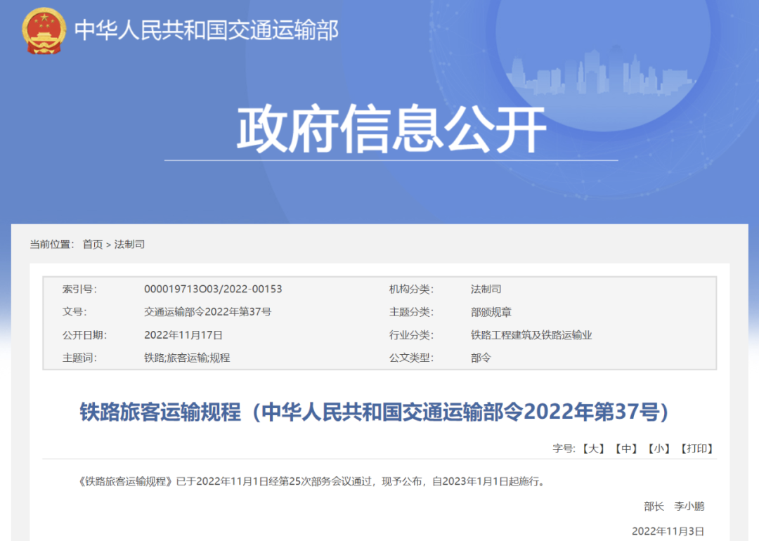 17日,交通運輸部網站公布修訂后的《鐵路旅客運輸規(guī)程》,自2023年1月1日起施行。