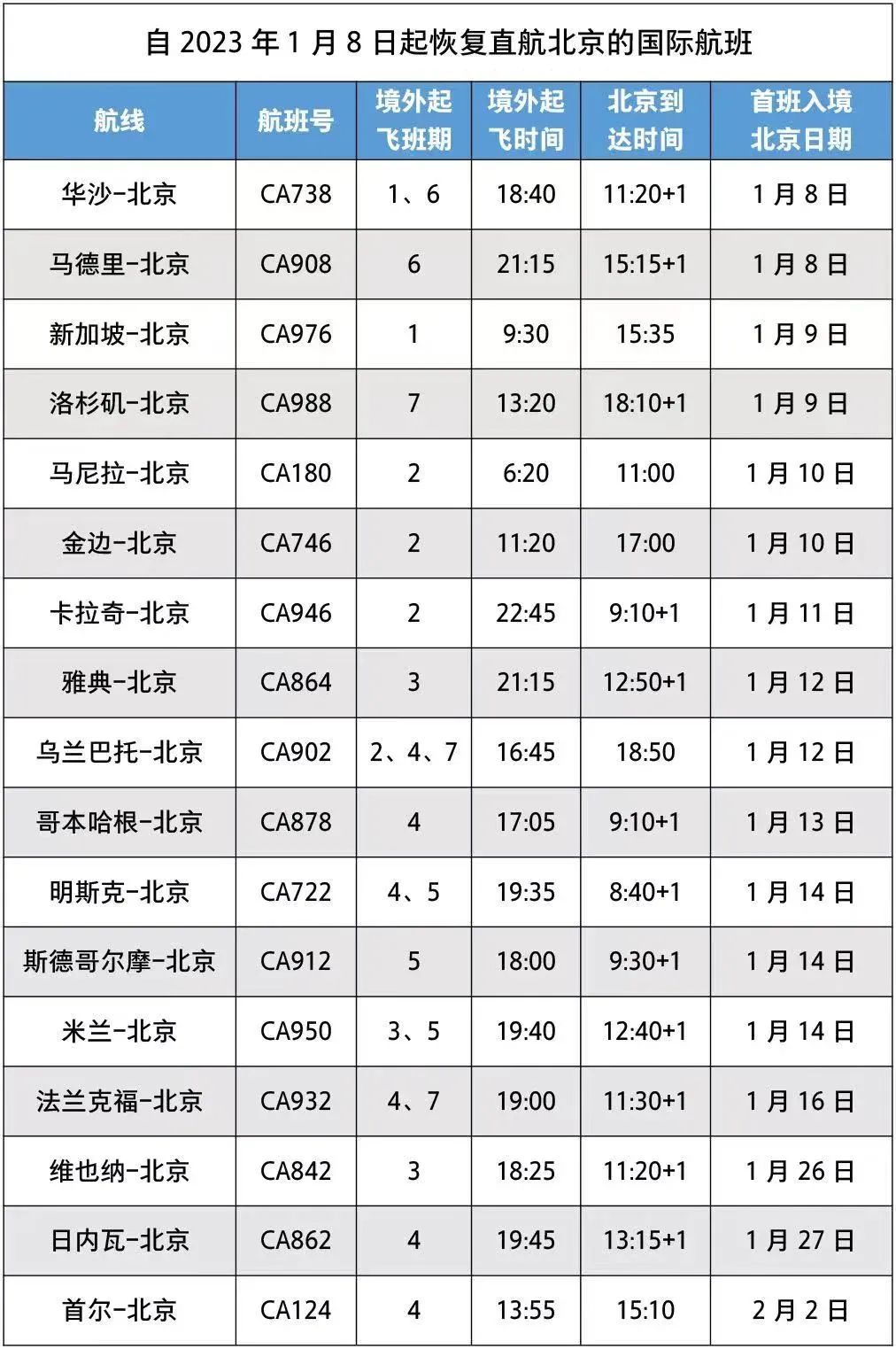 按照最新航班計(jì)劃,自2023年1月8日起,國(guó)航的17個(gè)國(guó)際航班恢復(fù)直航北京。其他目的地為北京的國(guó)際航班也將陸續(xù)調(diào)整。