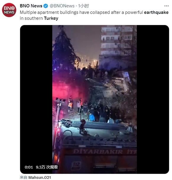 土耳其強(qiáng)震造成建筑物坍塌。圖片來源:BNO社交媒體賬戶截圖