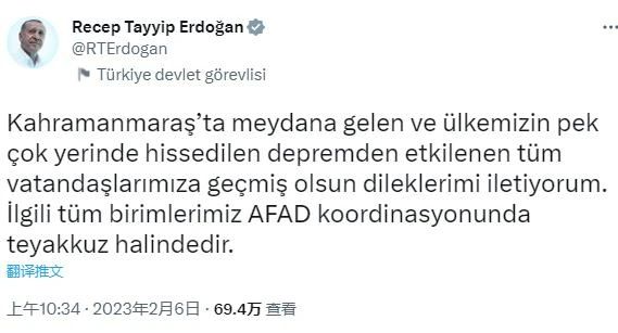 土總統(tǒng)埃爾多安在社交媒體上表示,搜救隊(duì)已被派往受地震影響的地區(qū)。他表示,土耳其全國多地有震感,并寫道,“希望我們能盡快一起度過這場(chǎng)災(zāi)難。”